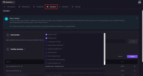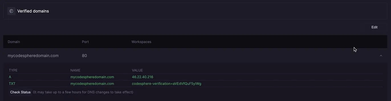 Now that your domain is verified, you can connect workspaces to your domain by pressing edit, and selecting your workspaces from the dropdown: