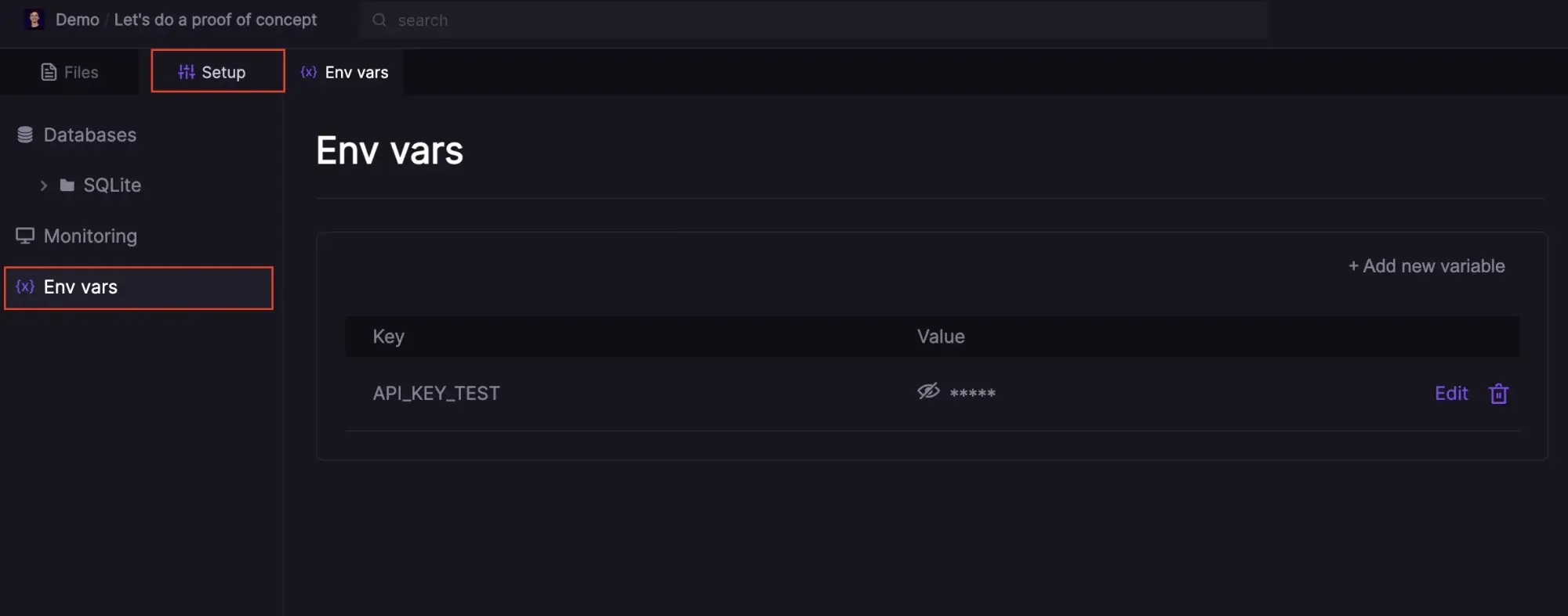 Environment Variables are connected to a specific workspace. That allows you to set different Variables for example in staging and production environments. Navigate to the workspace you want to add or modify Environment Variables and click on Setup. There you will find the Environment Variables tab.