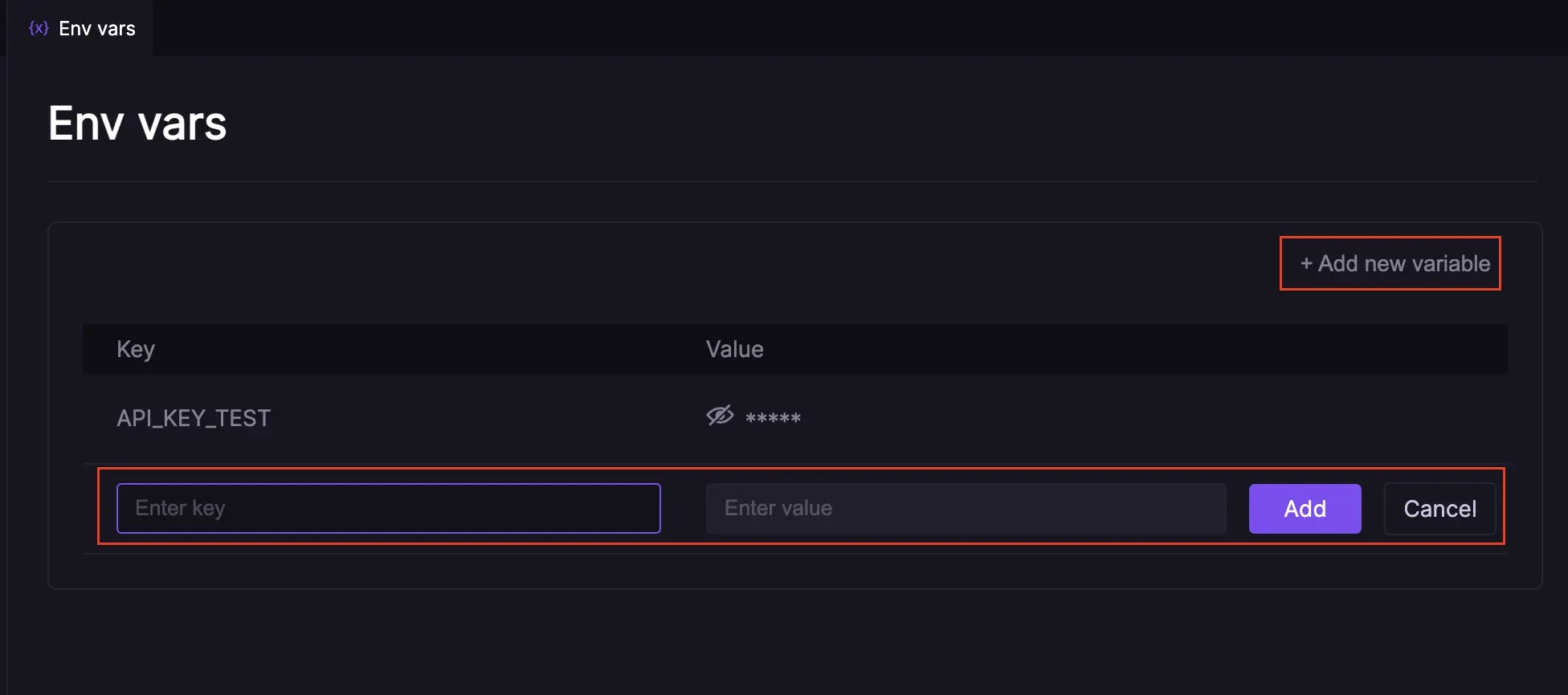 In this window you can set, view and edit all your environment variables. Because Environment Variables often contain secret keys, by default the values are concealed by stars, you can reveal the value via the eye icon.